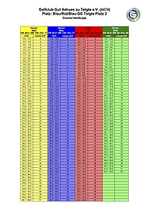Vorgabetabellen (PDF) für Damen und Herren für unsere 18-Loch Bahn in der Kombination Rot-Blau-Rot (Par 70).